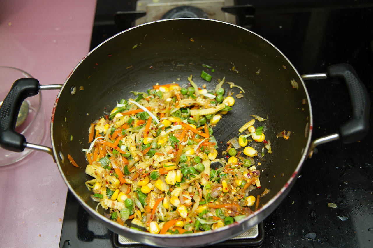 In a skillet, heat some oil and saute the onions. After about 3-4 minutes add the shredded cabbage, carrot slices and baby corn verticals. Put a lid on the skillet ad let this cook for about 5 minutes.