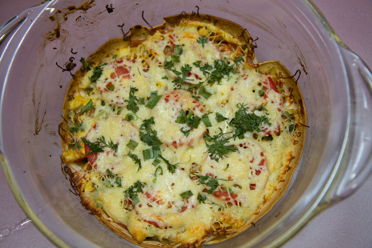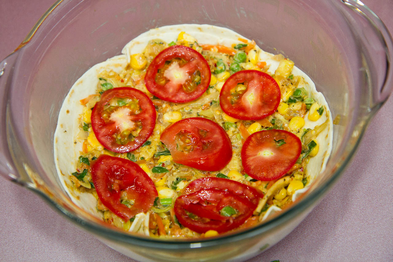 Place one tortilla on the dish and layer it with vegetable filling and sprinkle some cheese on top. Repeat with another layer of tortilla, veggies, tomato slices, and then a generous layer of cheese. Sprinkle some coriander and it is ready to bake.