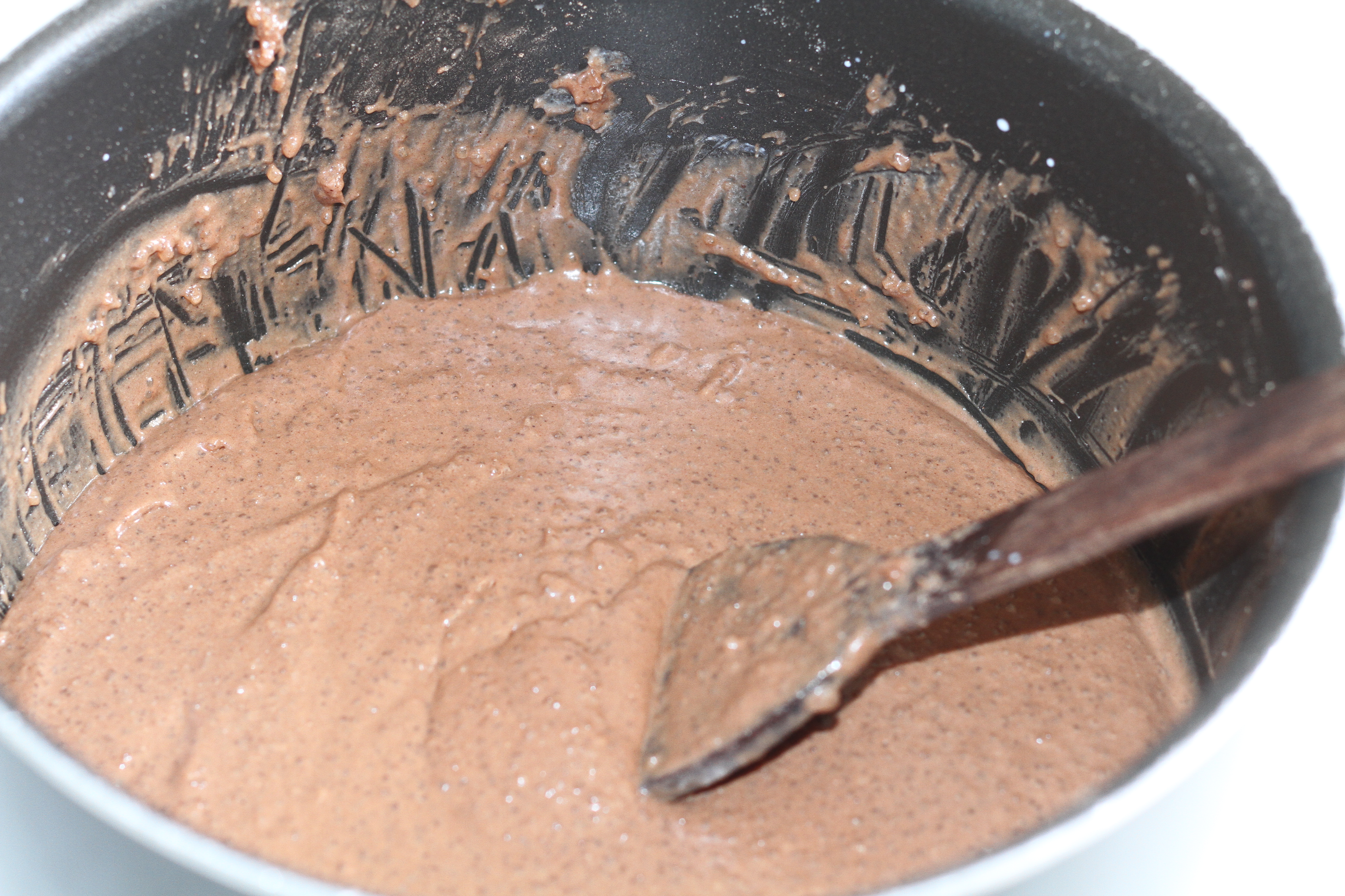 After an hour, start cooking the mixture and let it boil on medium high flame. Now that’s when you need to stir it continuously, but it is not difficult as the sweet smell of the cocoa will ensure you are close to the stove. 🙂 After about 7-8 minutes (depending on your pan and the gas flame), the mixture will look like this :
