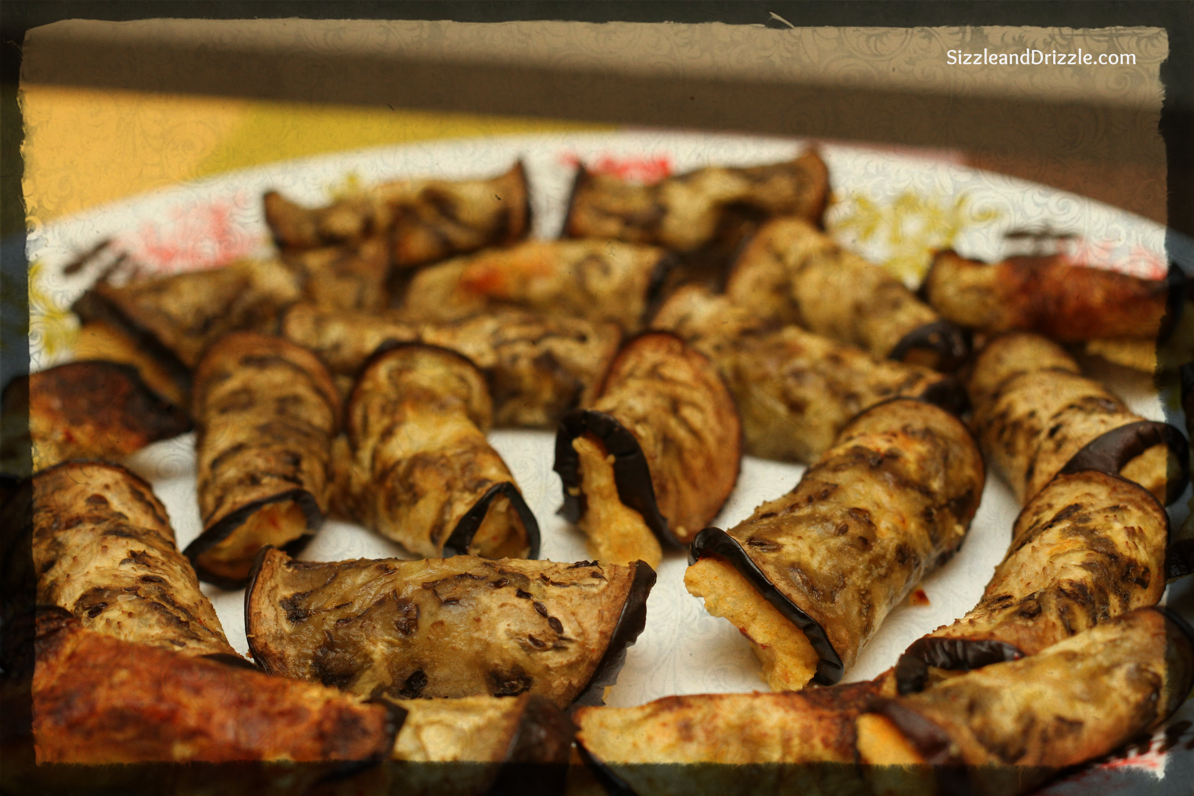 - Fill the eggplant slices with hummus; roll them tightly, and again bake for 10-15 mins. Take care to see that while the rolls turn deep brown-black in color, they should not get burnt.