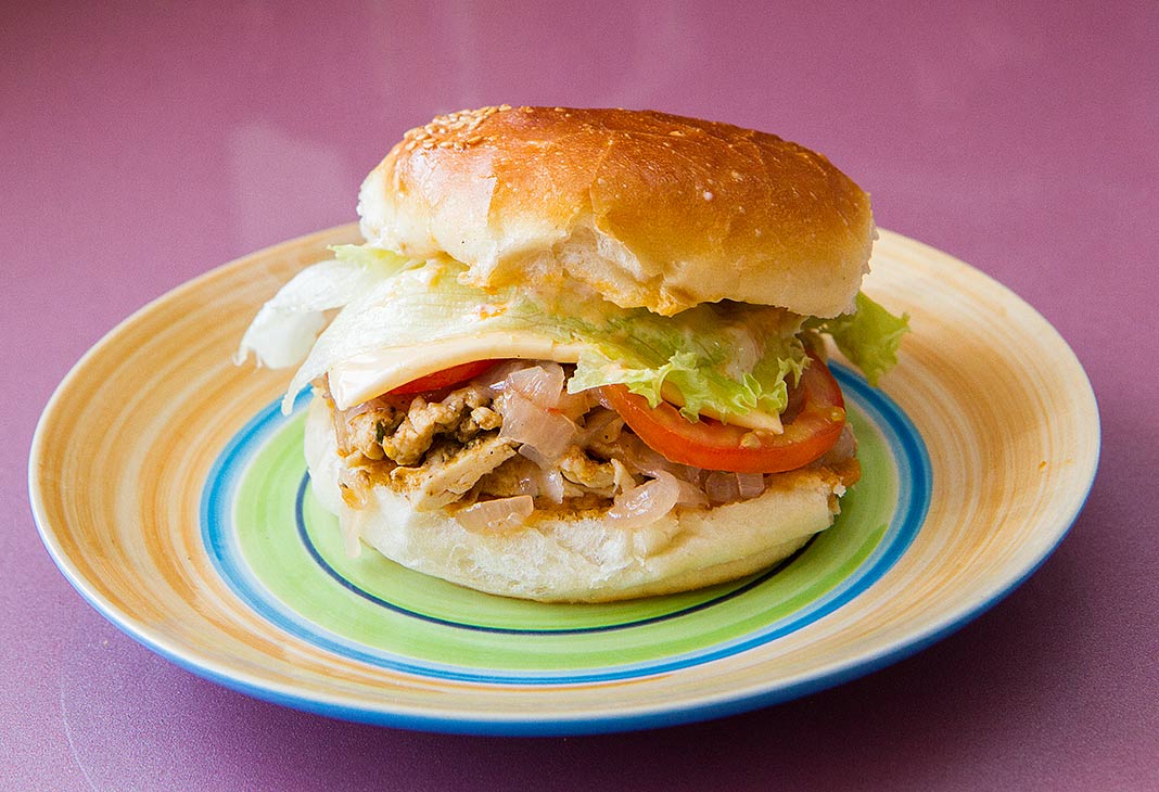 - Prepare the burger by putting a generous amount of caramelised onions on the lower part of the bun, then one part of the chicken slice, top it with 3-4 slices of fresh tomatoes, 1-2 leaves of iceberg lettuce, then a cheese slice and then the mayo layered top part of the bun.