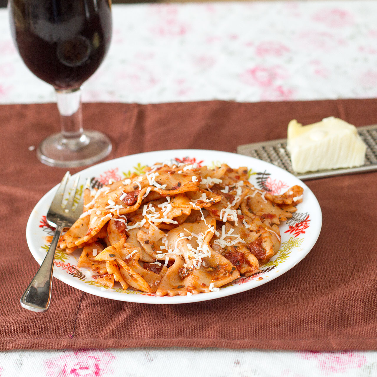 This pasta in red wine sauce tastes excellent with garlic bread!