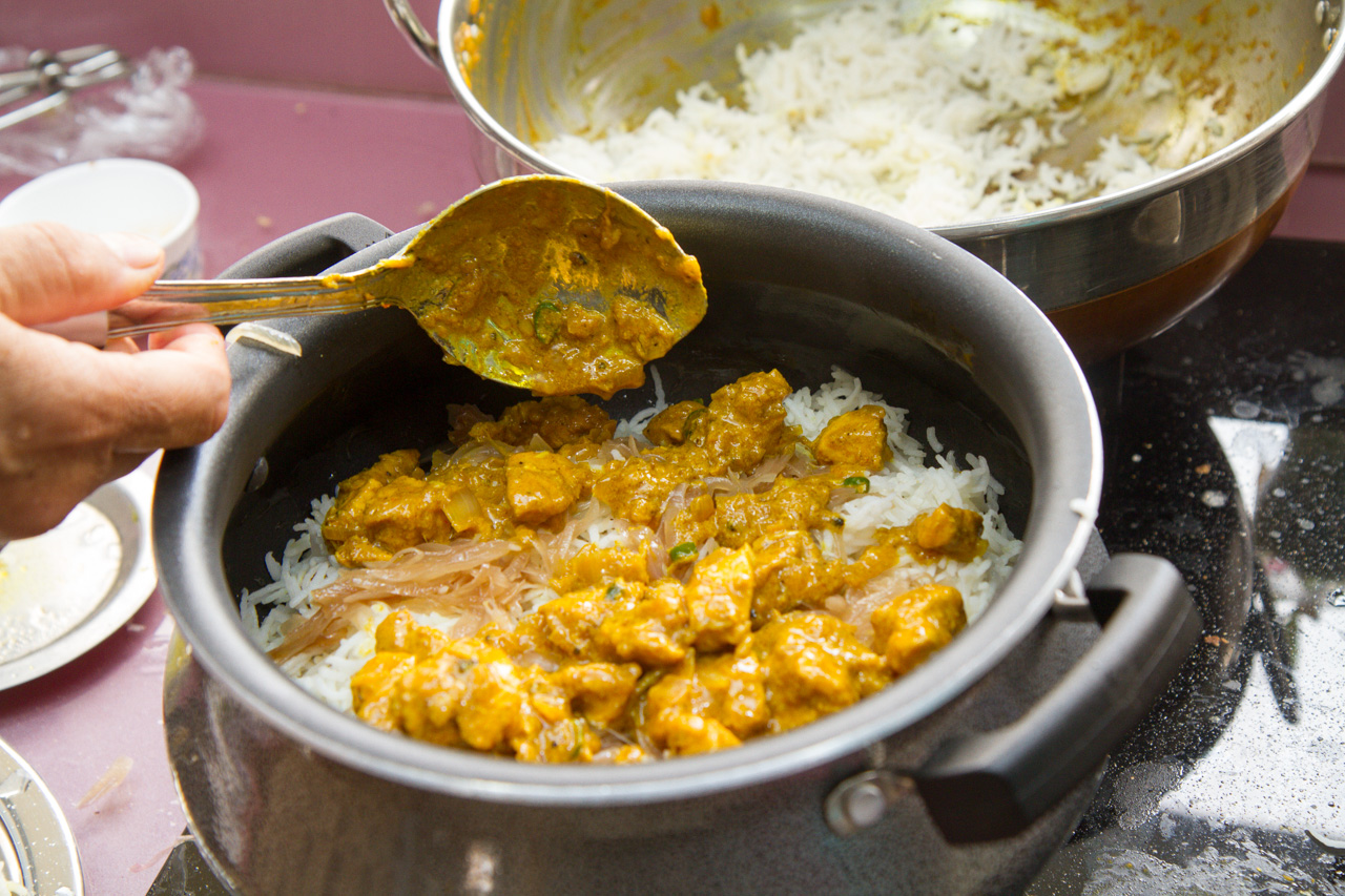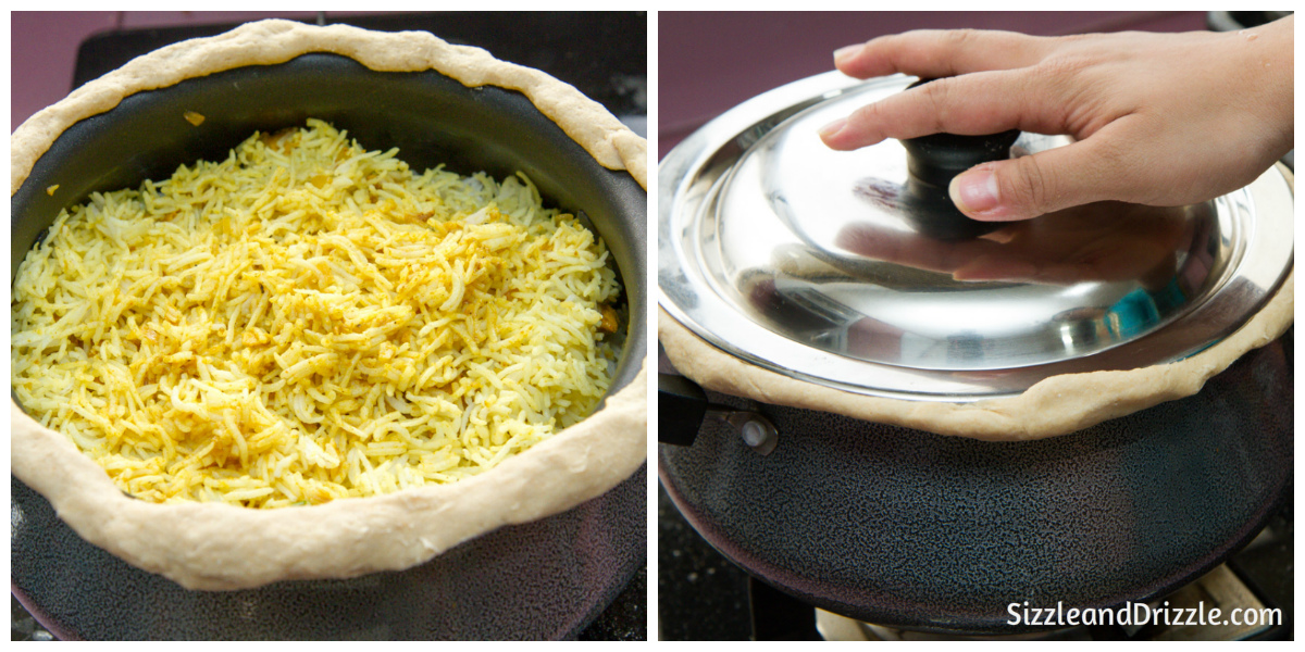- In a large lipped saucepan / kadhai, alternate layers of rice and chicken, starting and ending with rice. Cover the pan and cook over very low heat for 13-15 minutes until the rice is cooked. The aim is to create a steam inside the saucepan to let the flavors mingle and get distributed. So we used some sticky whole wheat dough to line the top of the pan, before covering it with a lid. Like this :
