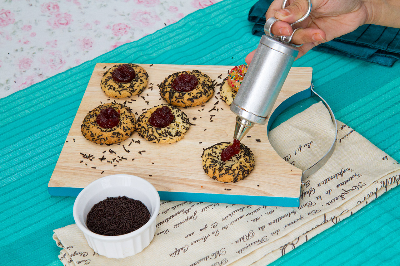 - I piped some strawberry jam on the cookies. You can even try chocolate icing or raspberry jam. Just spoon it in the indentation on the cookies.