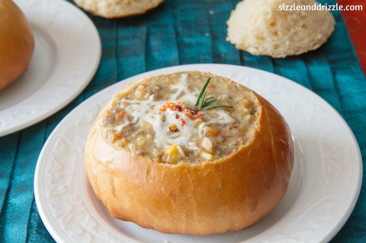 Enjoy this chowder steaming hot, with some cheese and chilli flakes on top. That melted cheese on top is like the cherry on the cake. Grab spoonfuls of bread with the chowder and munch on the flavorful bread once you are done.