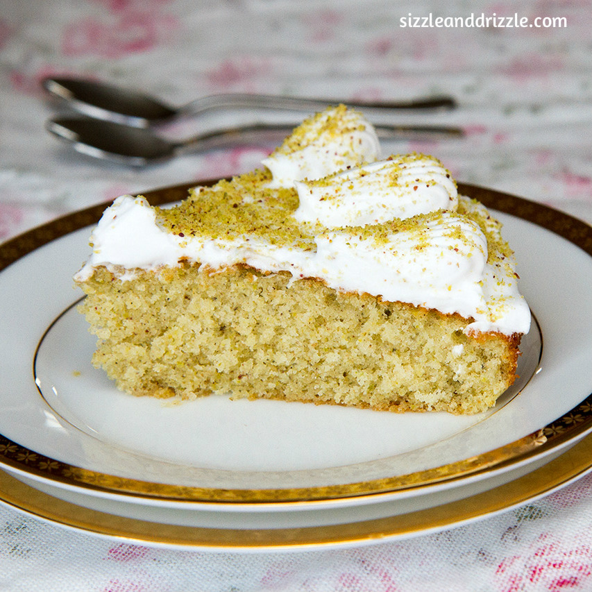 - Once the cake is cooled completely, spread it with the whipped cream and drizzle with some powdered pistachios.