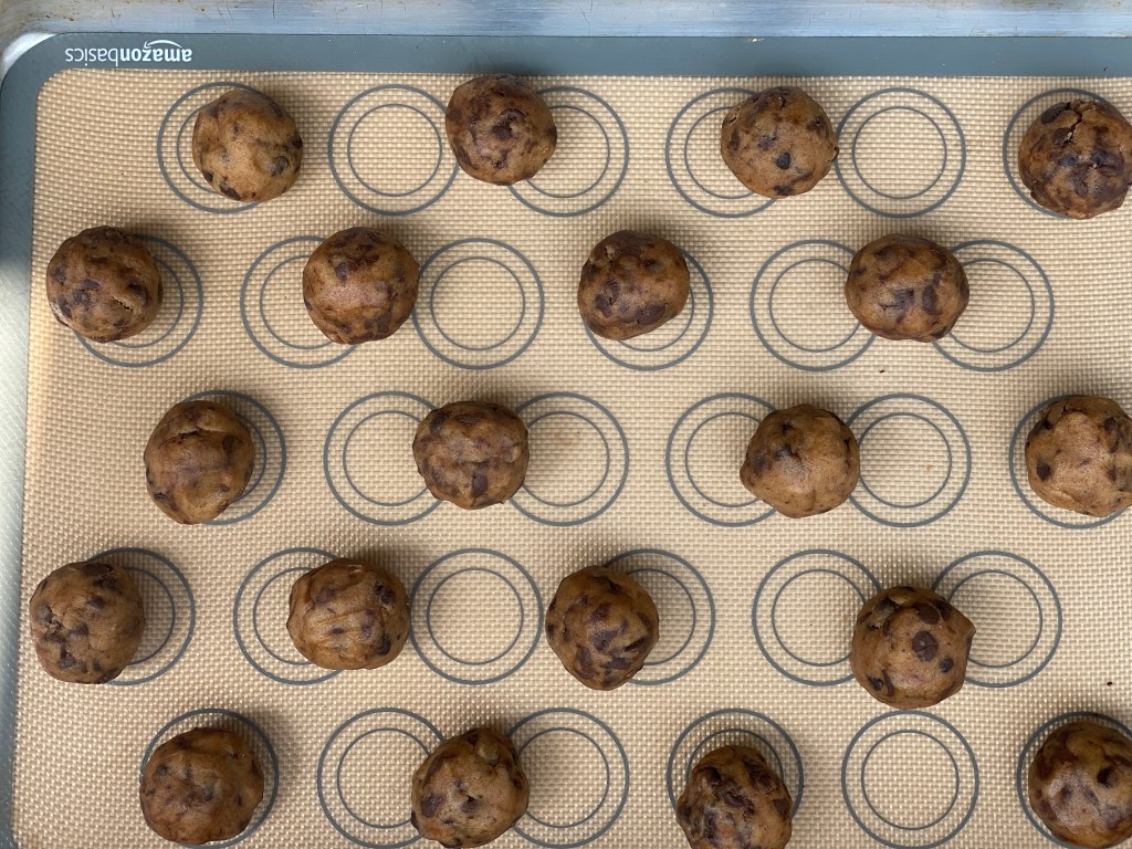 - Once ready to bake, take the dough out of the fridge and let it sit at room temperature for 5 mins. Then take 1.5 tablespoon dough and form it into a ball with your hand. Place it on a parchment paper covered baking tray. (See notes)